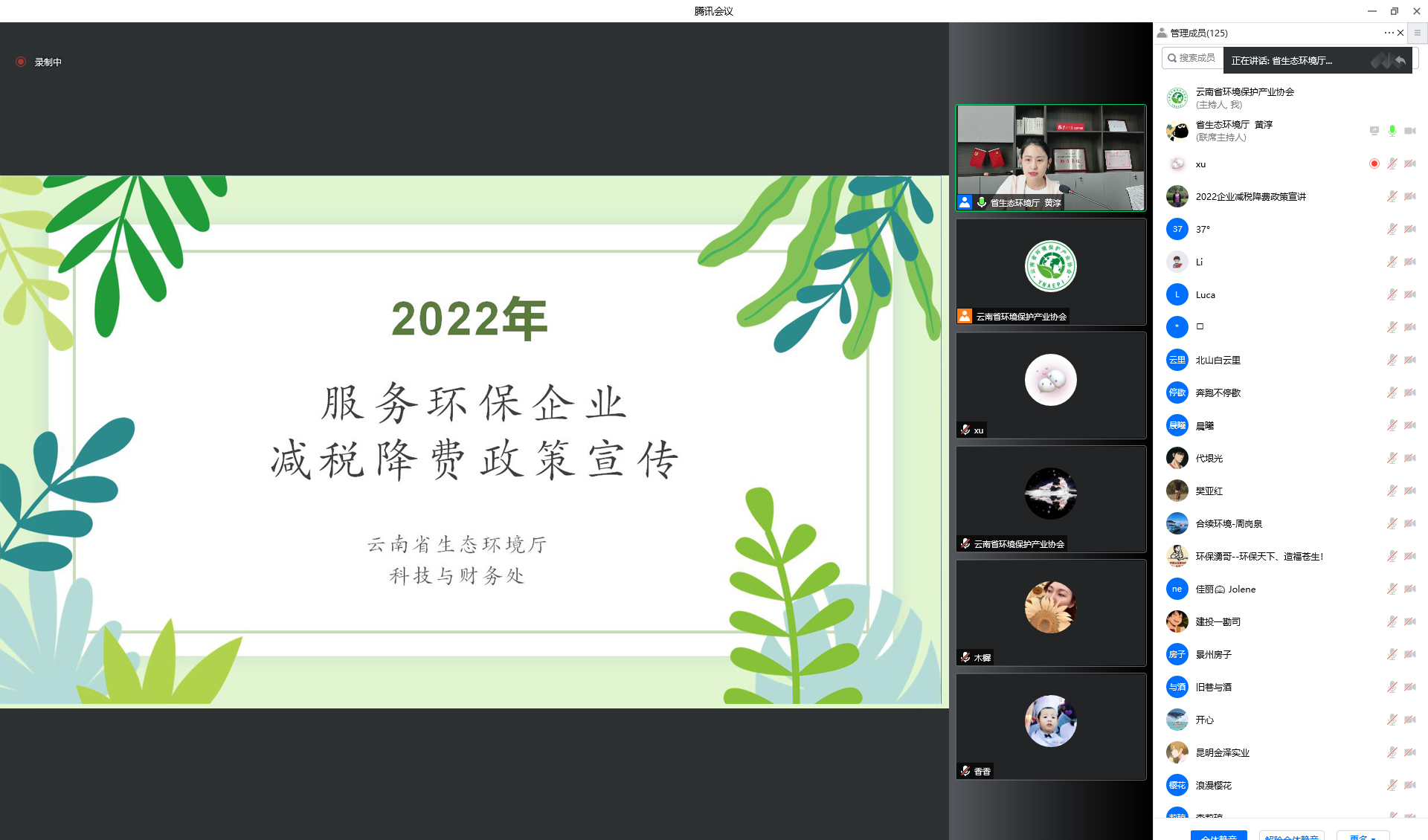 為深入貫徹黨中央國務(wù)院穩(wěn)住宏觀經(jīng)濟大盤的系列部署,積極助力企業(yè)紓困,服務(wù)環(huán)保企業(yè),云南省生態(tài)環(huán)境廳聯(lián)合云南省環(huán)境保護產(chǎn)業(yè)協(xié)會于2022年6月10日上午開展了面向全省環(huán)保企業(yè)的減稅降費政策宣講活動,云南省生態(tài)環(huán)境廳科技與財務(wù)處一級主任科員黃淳介紹了2022年新出臺的國家及云南省的相關(guān)減稅降費政策。