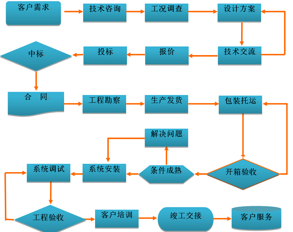 我公司經(jīng)過(guò)多年的經(jīng)驗(yàn)總結(jié),形成了一套完整合理的客戶服務(wù)流程體系,服務(wù)流程包括銷售服務(wù)、系統(tǒng)設(shè)計(jì)、采購(gòu)、生產(chǎn)、檢驗(yàn)、工程實(shí)施、投運(yùn)、維護(hù)等各個(gè)環(huán)節(jié)。公司對(duì)相關(guān)的服務(wù)流程持續(xù)的完善和優(yōu)化,使系統(tǒng)服務(wù)的質(zhì)量管理更加標(biāo)準(zhǔn)化、程序化、規(guī)范化,為系統(tǒng)服務(wù)工作奠定了扎實(shí)的基礎(chǔ)。