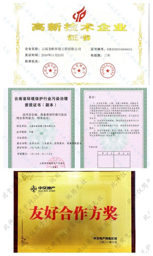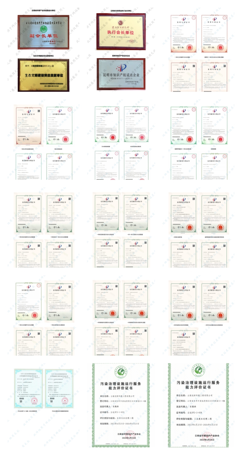 公司持有環(huán)保工程專業(yè)承包二級(jí)、市政公用工程總承包三級(jí)、建筑工程總承包三級(jí)、污染治理乙級(jí)、污染治理設(shè)施運(yùn)行服務(wù)二級(jí)資質(zhì)證書。前后獲得“十二五”生態(tài)文明建設(shè)突出貢獻(xiàn)單位、云南省省級(jí)成長型中小企業(yè)、云南省知識(shí)產(chǎn)權(quán)優(yōu)勢企業(yè)、云南省科技型中小企業(yè)、云南省專精特新中小企業(yè)、招商蛇口最佳合作伙伴、中交置業(yè)友好合作方獎(jiǎng)等榮譽(yù)。