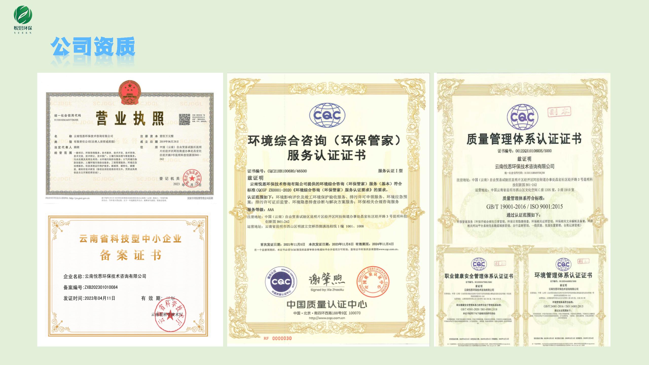 作為一家專業(yè)的環(huán)保管家服務公司,對于企業(yè)環(huán)保服務我們具有詳細的工作服務流程和完整的服務管理體系。人才團隊是推動公司發(fā)展必不可少的核心因素,公司所管理的團隊包含環(huán)保管家專職技術人員,環(huán)保各大領域?qū)<遥h(huán)保設施建設維修工程人員,環(huán)境監(jiān)測人員,輻射環(huán)境監(jiān)測人員等。公司人才多年從事相關行業(yè),具有豐富的專業(yè)經(jīng)驗。同時公司也非常注重人才的培養(yǎng),積極為新人創(chuàng)造內(nèi)部學習、實踐的機會,鼓勵和扶持新員工接受外部專業(yè)培訓及專業(yè)考核,創(chuàng)造適合人才快速成長的環(huán)境,為公司的人才儲備和可靠的環(huán)保管家服務打下了良好基礎。2021年11月5日通過中國國家質(zhì)量認證中心(CQC)頒發(fā)的《環(huán)境綜合咨詢(環(huán)保管家)服務認證證書》,證書編號:CQC21HB1006R0/46500,認證范圍包含:環(huán)境影響評價及竣工環(huán)境保護驗收服務、排污許可申領服務、環(huán)境應急預案;排污許可證后監(jiān)管、環(huán)境隱患排查爭端與解決方案服務;環(huán)保相關合規(guī)咨詢服務。